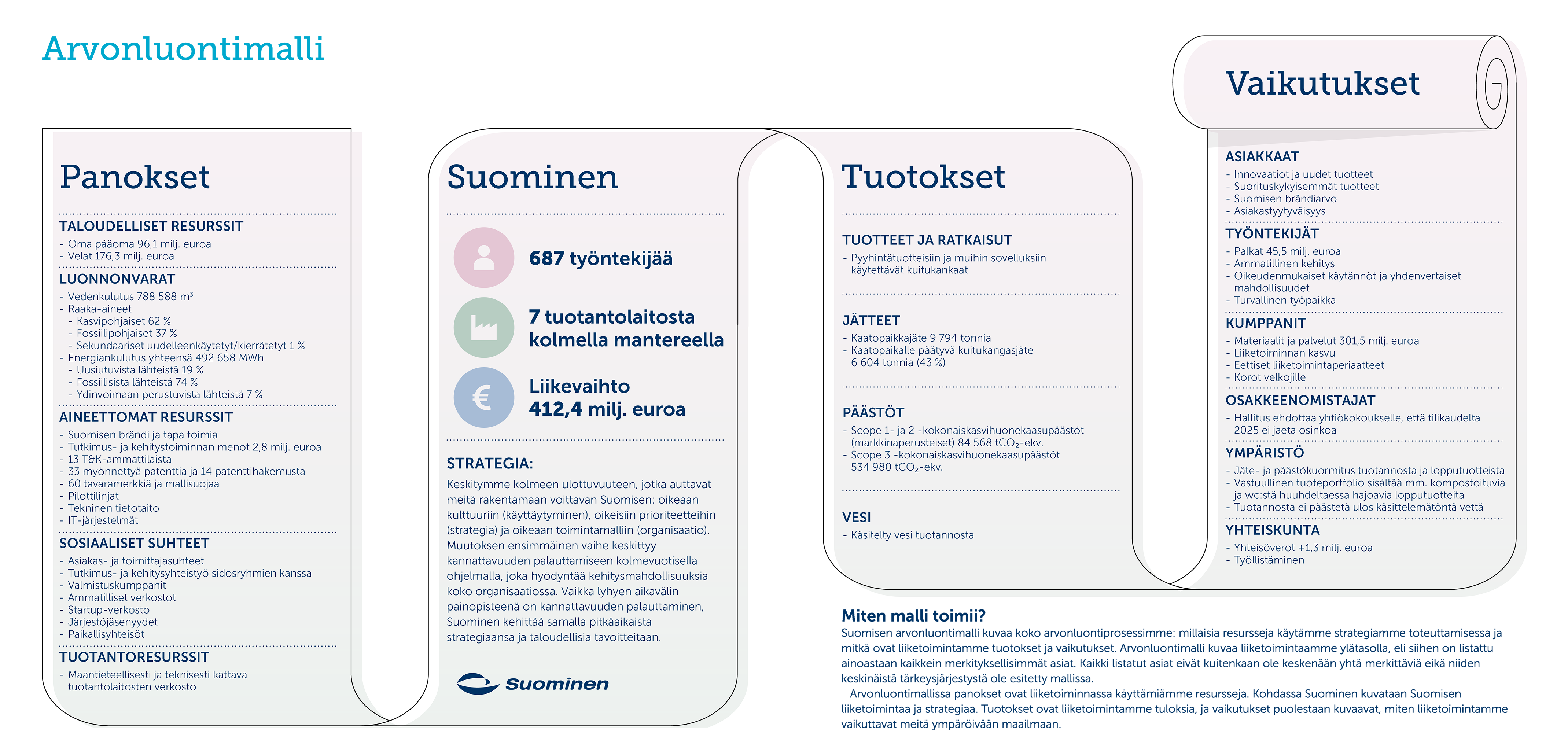 Suominen on kuitukangasvalmistaja, joka toimii globaaleilla markkinoilla. Suominen luo arvoa hankkimalla kuituraaka-aineita ja valmistamalla niistä kuitukankaita, joita asiakkaamme jatkojalostavat tuotteiksi sekä kuluttajille että ammattikäyttöön.